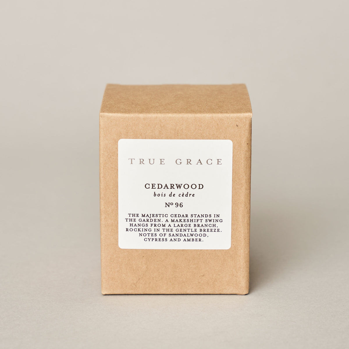 Our Cedarwood Small Candle fills the room with a soft and woody scent, rich with notes of Cedar tree, Amber, Sandalwood and Musk. Handmade in small batches and beautifully presented in a timeless glass vessel complete with the True Grace emblem, this small 20cl candle has a burn time of 30 hours and is perfect for keeping the Living Room or Study, fresh.