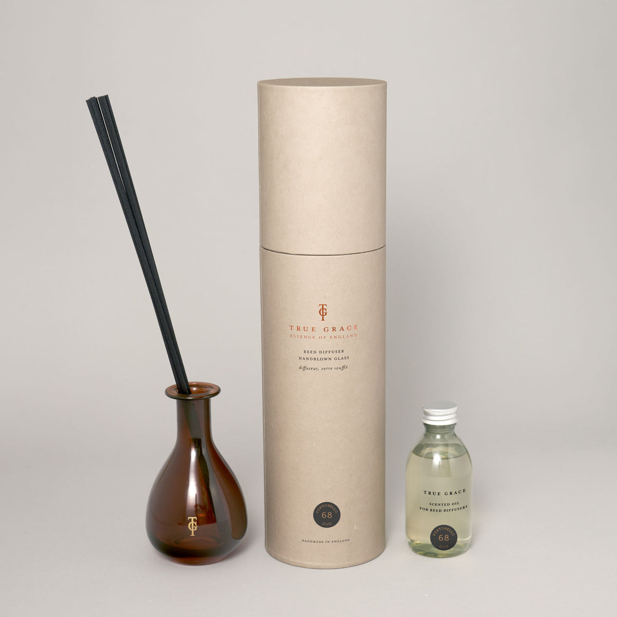 Our Portobello Oud Diffuser Set fills the room with a spicy and woody scent. Made in small batches at our Wiltshire factory and fragrant with notes of Patchouli, Leather, Sandalwood & Ginger, this Burlington diffuser is perfect for keeping the Living Room or Study, fresh. Presented in a hand-blown amber teardrop glass vessel, this diffuser contains 20% fragrance – the equivalent of a ‘pure perfume’ and stays fresh for up to 10 weeks. Sleek and stylish and accompanied with a bundle of 10 black rattan reeds, you can replenish the glass bottle in this set with our diffuser refill range.