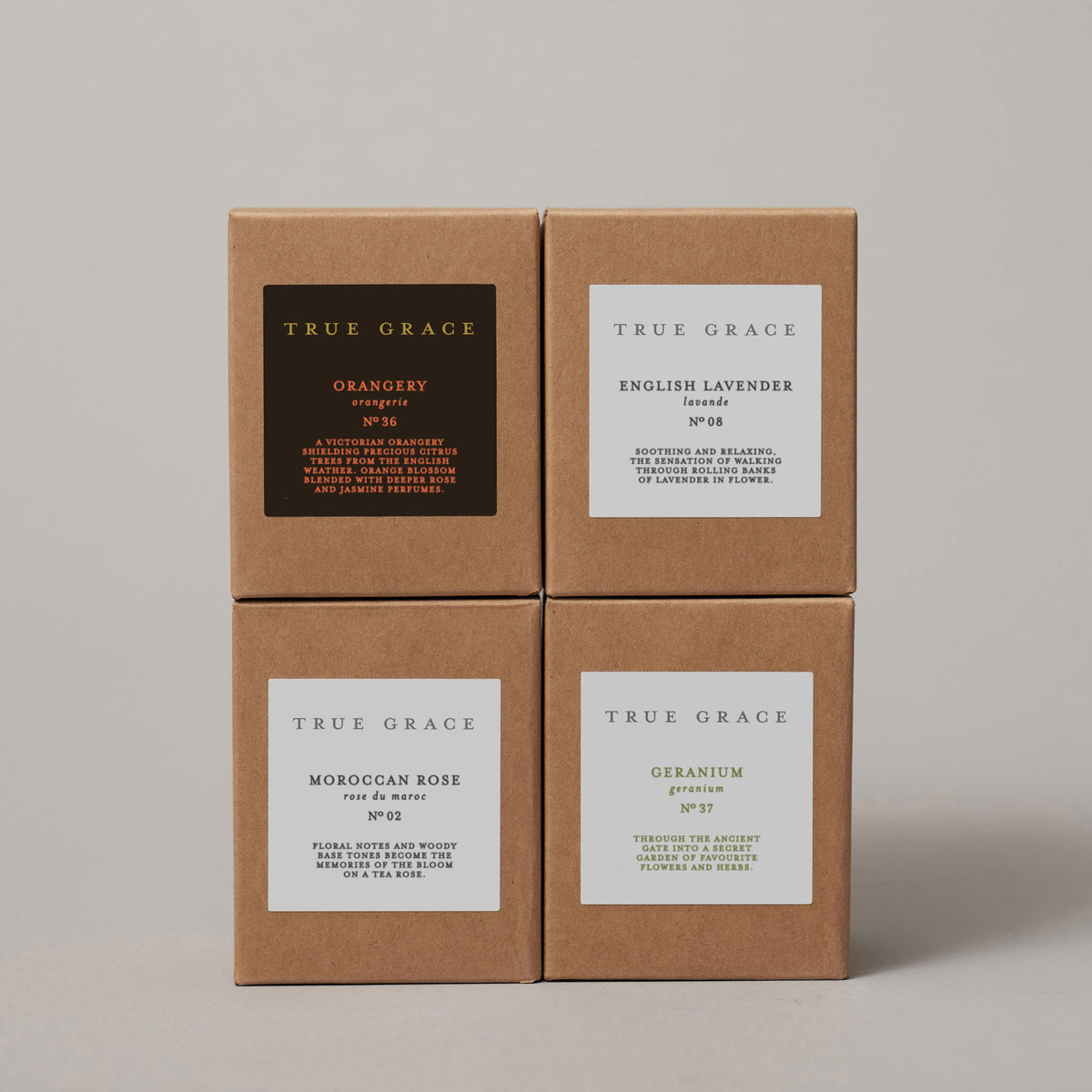 Contains the following: Orangery, English Lavender, Moroccan Rose and Geranium. Each candle is 145g in size, has an approximate burn time of 30 hours & comes packaged in a lovely labelled kraft box.