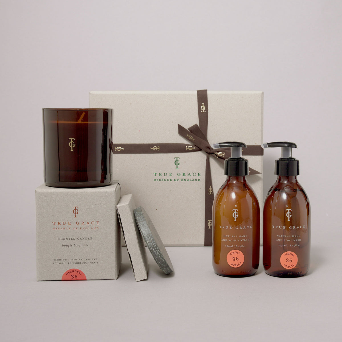 Our Orangery fragrance fills the room with a relaxing and calming scent, rich with notes of Orange Blossom, Amber & Petitgrain. Handmade in small batches, this Orangery self-care gift set contains our medium, 45hour burn, candle with a matching hand wash and lotion set, all in amber glass. Carefully packaged in our gift box complete with True Grace ribbon, this is the ideal gift for someone to take a moment out of their busy routine and relax.