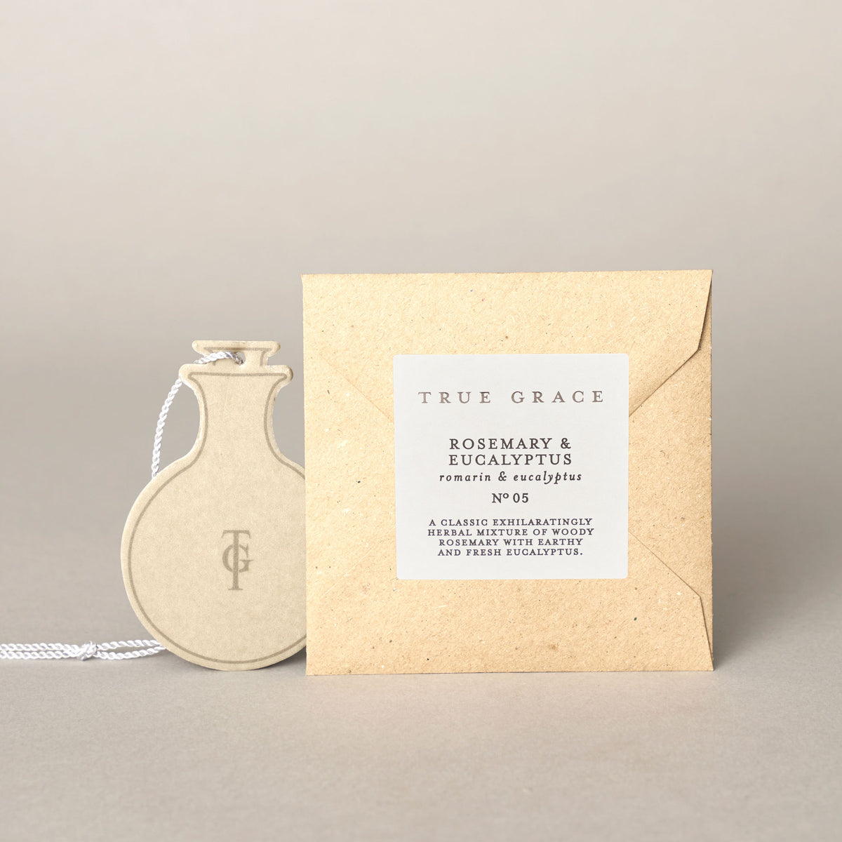 Perfect for trying out a new True Grace fragrance, our Rosemary & Eucalyptus Sample Cards will keep any space refreshed with an invigorating and clean scent. Hand dipped in small batches and rich with notes of Garden Rose, Sandalwood & Citrus, the samples stay fresh for up to 4 weeks. Hang in your wardrobe, car, or take with you on your travels.