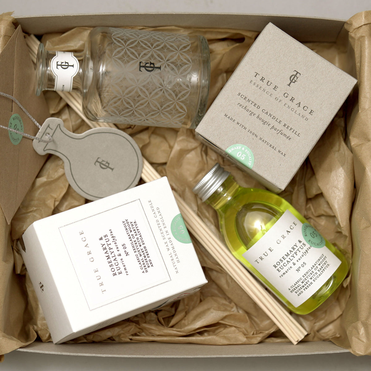 Our Rosemary & Eucalyptus fragrance fills the room with an invigorating and fresh scent, rich with notes of Frankincense and Rosemary & Eucalyptus. Handmade in small batches, this Rosemary & Eucalyptus gift set contains a classic candle, classic candle refill, room diffuser and a pack of scented leaves. The set is beautifully presented in a recyclable gift box complete with our signature True Grace ribbon, making for a truly thoughtful gift.