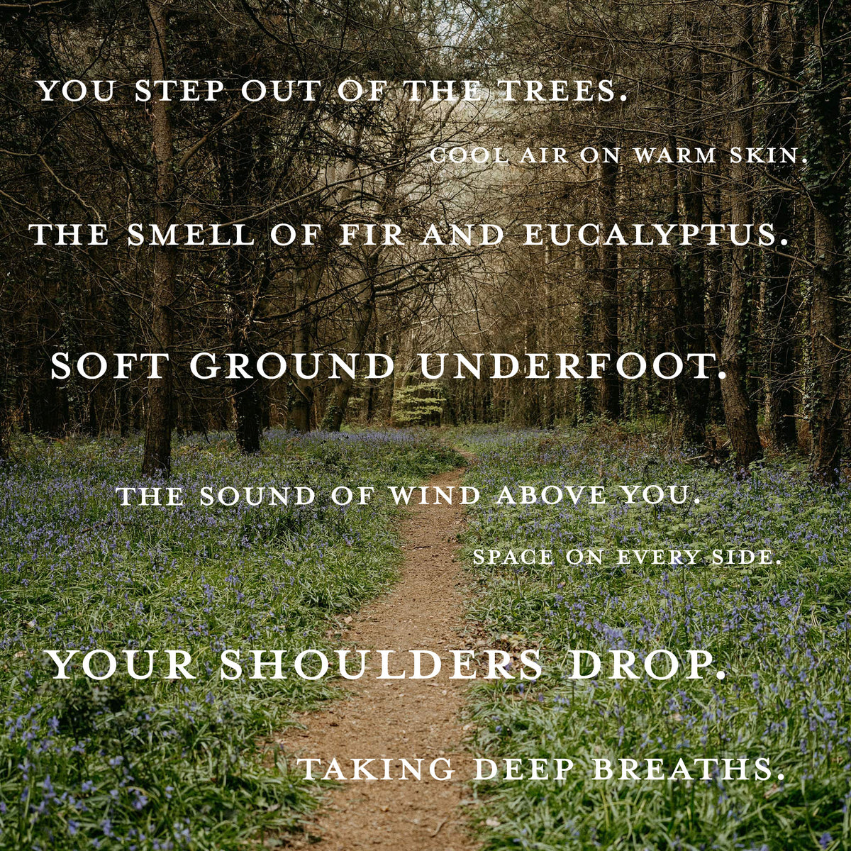 YOU STEP OUT OF THE TREES. COOL AIR ON WARM SKIN. THE SMELL OF FIR AND EUCALYPTUS. SOFT GROUND UNDERFOOT. THE SOUND OF WIND ABOVE YOU. SPACE ON EVERY SIDE. YOUR SHOULDERS DROP. TAKING DEEP BREATHS.