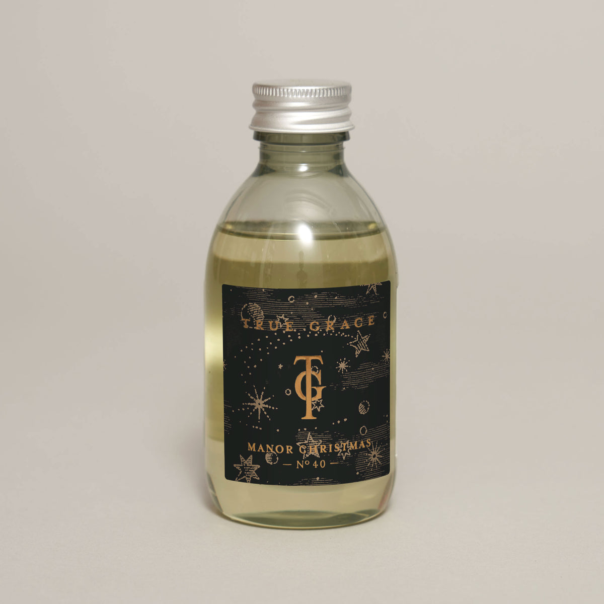 Forming part of our Christmas Range, this 200ml Manor Christmas Diffuser Refill fills the room with a spicy and warming scent. Made in small batches at our Wiltshire factory and fragrant with notes of Orange, Apple & Cinnamon, the refill is perfect for keeping your living room, study or hallway, cosy. Presented in a 100% recyclable plastic bottle, the refill contains 20% fragrance – the equivalent of a ‘pure perfume’ and stays fresh for up to 10 weeks. Accompanied with a bundle of 10 black rattan reeds, the refill is great for topping up your existing True Grace glass bottles.